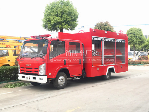 這款車型采用五十鈴700P底盤打造而成、五十鈴150馬力發(fā)動(dòng)機(jī),車輛尾部配備版遙控液壓尾門操作,方便快速的操控機(jī)器人上下車,車身兩旁配備了消防水帶固定架,方便存儲(chǔ)更多的水帶、前部設(shè)定了各種消防器材或者手抬消防泵器材室。